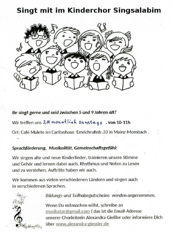 - 14. September 15.15 Uhr Auftritt beim Sommerfest des Caritashauses Mainz-Mombach (zusammen mit dem Kinderchor SINGSALABIM)